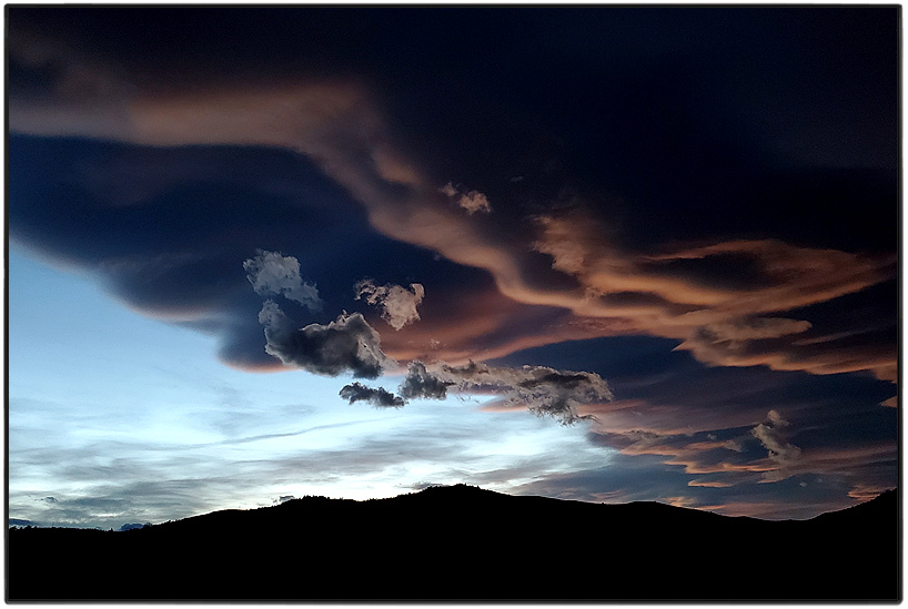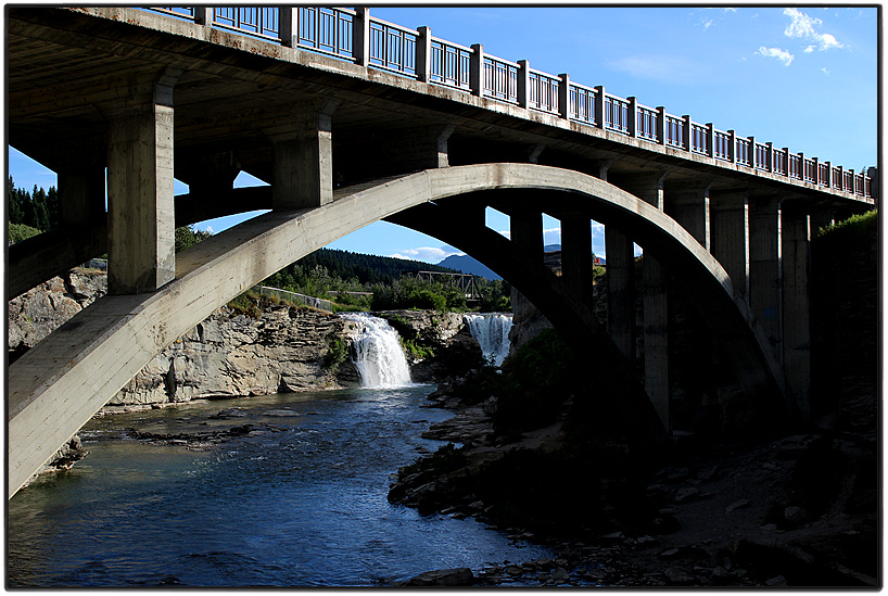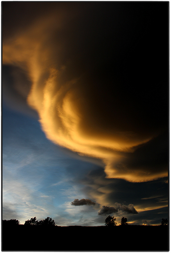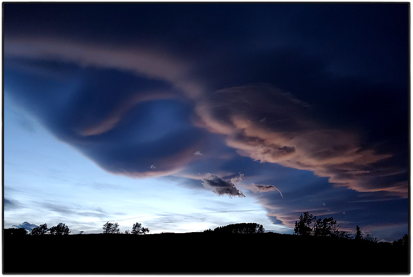 워터튼 타운사이트(Waterton Townsite)에 있는 캠핑장은 모두 예약이 되었다고 나와 중간에 캠핑장을 찾아야 했다. 핀처 크릭(Pincher Creek) 직전에 있는 런드브렉 폭포(Lundbreck Falls) 주변에서 캠핑장을 구했다. 크로우스네스트 강을 따라 조성된 캠핑장은 시설은 형편없었지만 사람은 꽤 많았다. 텐트를 치고 짐을 푼 다음 폭포 구경을 하러 나섰다. 캠핑장에서 다리를 지나 폭포로 연결되는 오솔길이 있었다. 폭포도 그리 대단하진 않았다. 강물이 두 갈래로 갈라져 떨어지는데 그 낙차가 12m라 했다. 폭포를 가까이서 조망할 수 있는 데크와 폭포 아래로 내려설 수 있는 계단도 설치되어 있었다. 잠시 산책하기엔 괜찮은 곳이었다. 저녁 식사를 마치고 텐트 밖으로 나왔더니 석양이 지는 하늘에 요상한 모습을 한 구름이 눈에 들어와 카메라를 들고 다리 위로 올랐다. 북쪽 하늘을 무대로 구름이 펼치는 멋진 공연을 30여 분에 걸쳐 감상할 수 있었다. 난생 처음 접하는 광경에 가슴을 조이며 마구 셔터를 누르지 않았나 싶다.