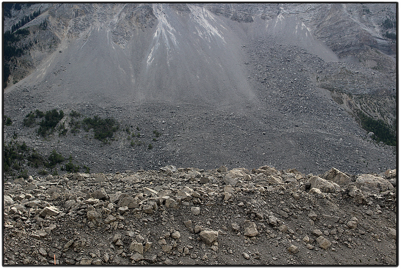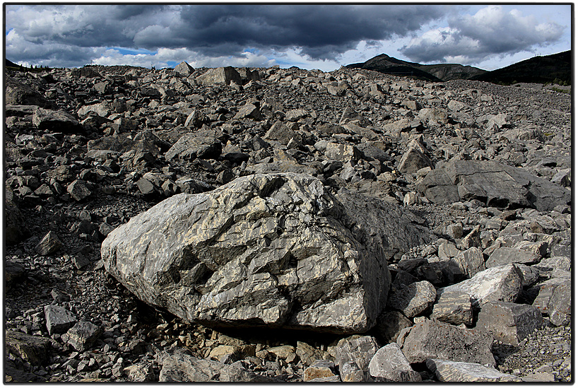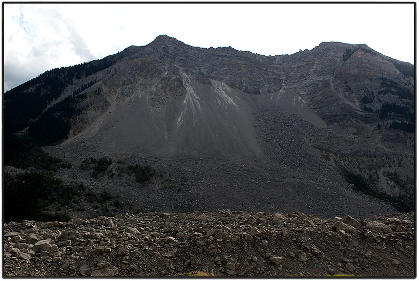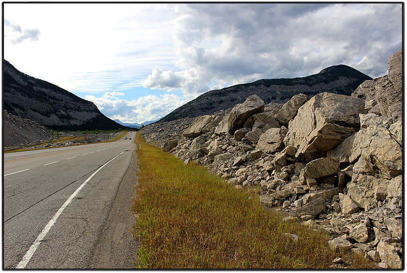 3번 하이웨이를 달려 브리티시 컬럼비아(BC) 주와 알버타(Alberta) 주의 경계선에 해당하는 크로우스네스트 패스(Crowsnest Pass, 1358m)에 올랐다. 이 지점은 캐나다 로키 산맥의 마루금, 즉 대륙분수령(Continental Divide)에 해당하기도 한다. 그 이야긴 마루금 서쪽에 떨어진 빗방울은 태평양으로, 동쪽에 떨어진 것은 대서양으로 흐르는 수계 역할을 한다는 것이다. 여기서 바라보는 해발 2,785m의 크로우스네스트 마운틴의 위용이 단연 독보적이었다. 조금 더 차를 달리니 프랭크 슬라이드(Frank Slide)가 나왔다. 슬라이드란 우리 말로 산사태를 의미한다. 도로 오른쪽으로 터틀 마운틴(Turtle Mountain, 2210m)이 있는데, 1903년 4월 29일 새벽 4시에 이 산 절반이 무너져 내려 엄청난 산사태를 일으킨 것이다. 하필이면 그 아래 프랭크란 광산촌이 자리잡고 있어서 600명 주민 가운데 90명 이상이 숨지는 사고가 발생했다. 돌더미에 묻힌 사망자를 찾아낼 수가 없어 정확한 숫자는 아직도 알지 못한다. 산사태 현장은 그대로 보존되고 있어 그 앞에 서니 절로 숙연해지는 기분이었다.
